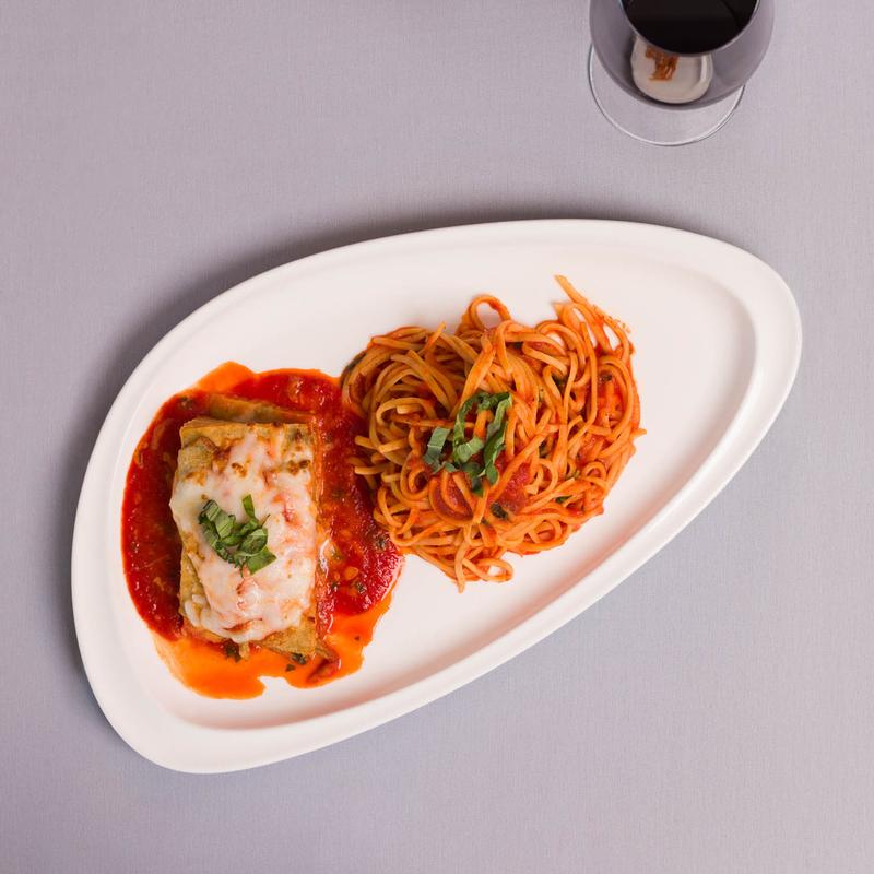 Eggplant parmigiana, Chef’s recipe. Served with a side of linguine pasta in a light spicy marinara sauce.