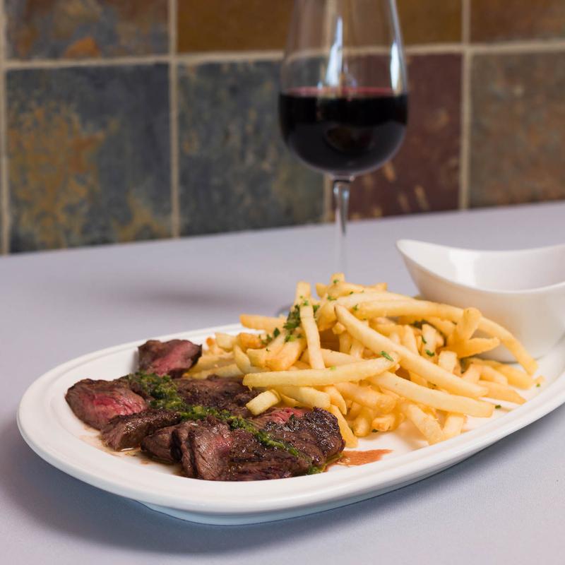 8oz skirt steak, pre-sliced, topped with parsley, garlic, shallots, dried oregano, red chili flakes, and EVOO. Served with garlic basil fries.