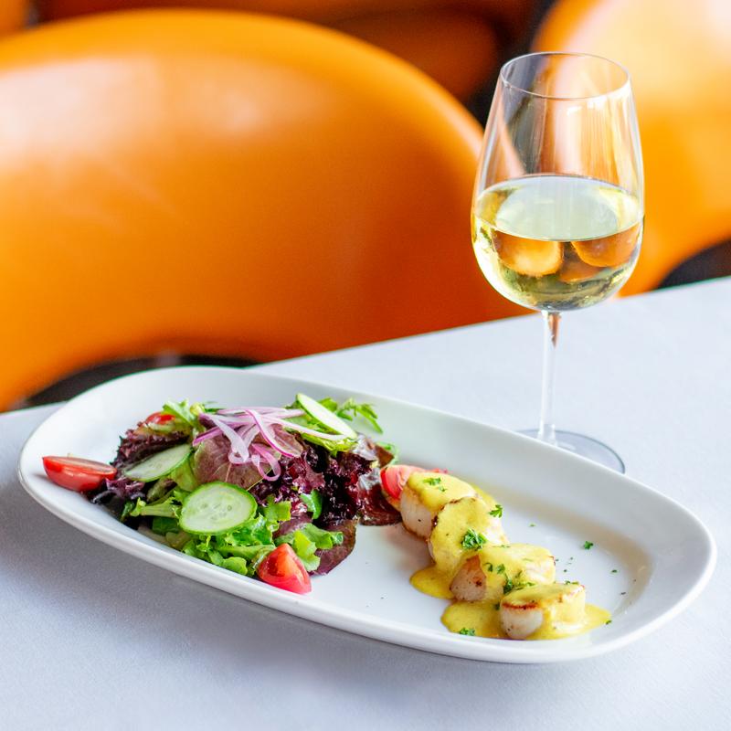 Pan seared scallops sautéed with shallots, white peppers, garlic, and a saffron cream sauce. Served with a side house salad.